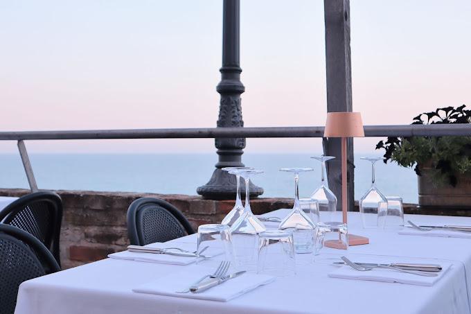 Nel cuore del antico borgo, gusta deliziosi piatti italiani di pasta, carne e pesce serviti su un'ampia terrazza in pietra affacciata sul mare e sulla città di Grottammare.